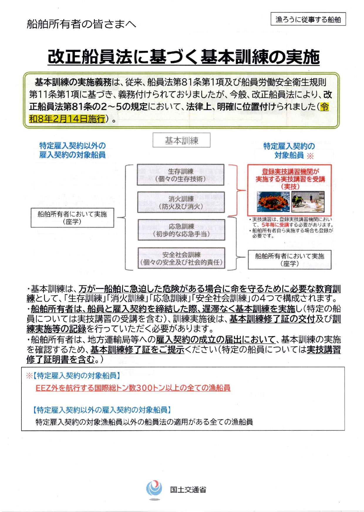 船員が緊急時に命を守るために必要な知識と技術(生存、消火、応急、安全)を習得するため講習会を行い、合わせてハラスメント防止や操業時の注意事項、報連相の重要性を再確認。